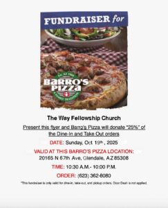 Barros Pizza Fundraiser October 19, 2025 10:30 am – 10:00 pm 20165 N 67th ave Glendale AZ 85308 Barros Pizza Directions